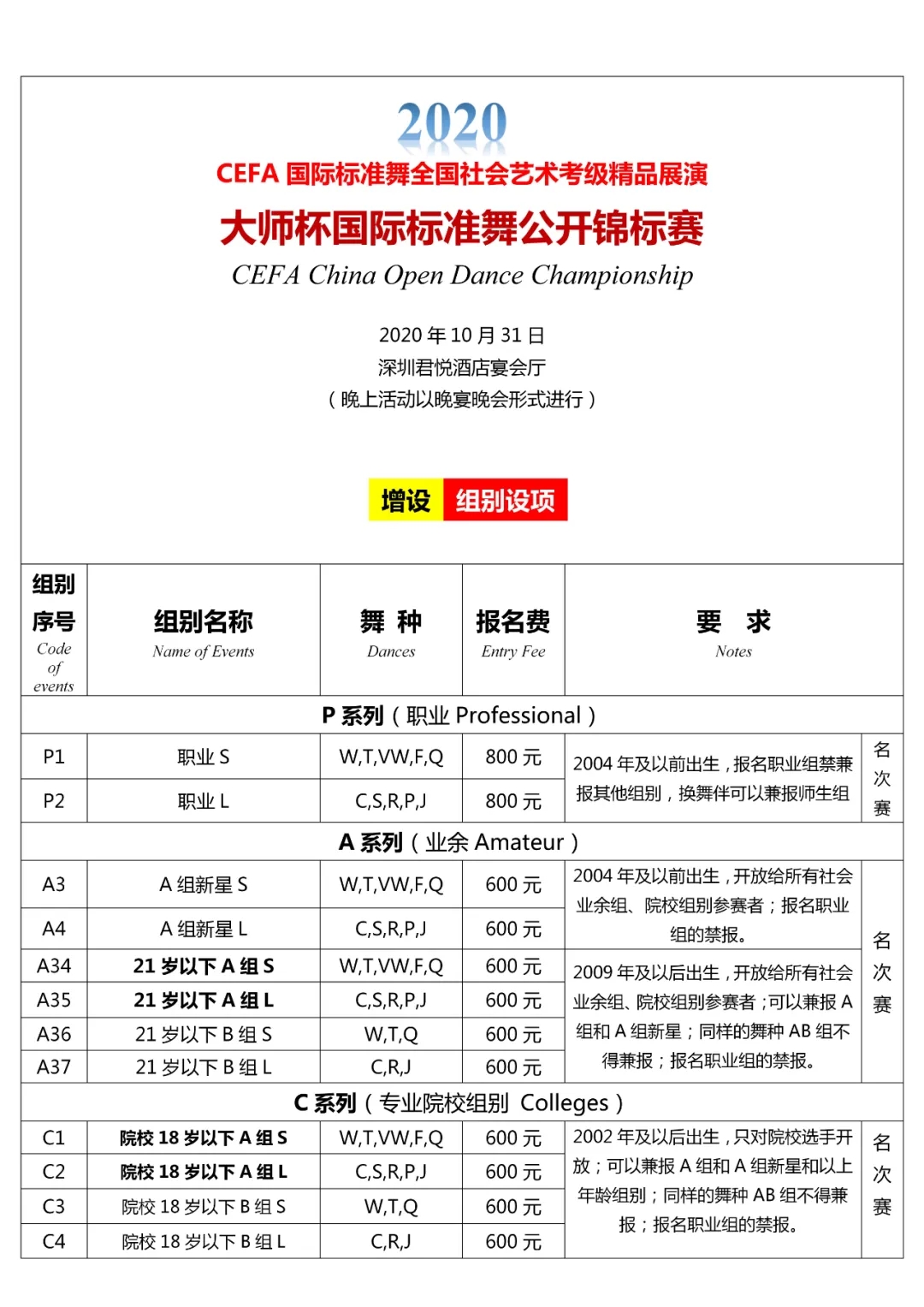增设组别设项 丨 2020全国展演暨大师杯公开赛(深圳君悦酒店)