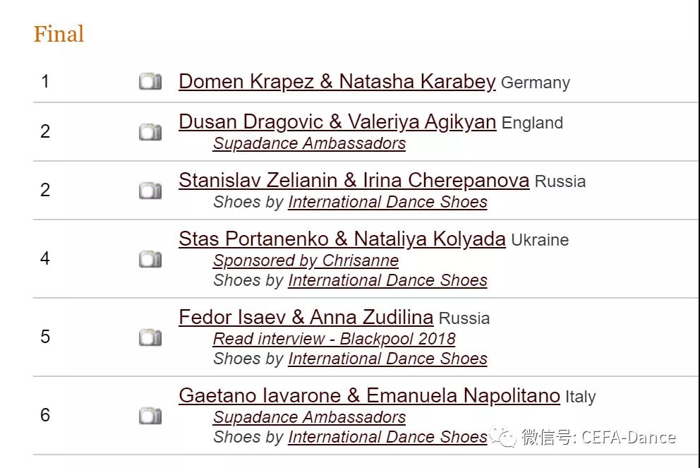 近年实力大增兼勇猛智慧并重的Dusan Dragovic & Valeriya Agikyan (英国) 超越众多高手跃升亚军,稳健的Stanislav Zelianin & Irina Cherepanova (俄罗斯)稳坐季军之位,灵巧多变的 Stas Portanenko & Nataliya Kolyada (乌克兰) 殿军,从业余冠军升级职业组的 Fedor Isaev & Anna Zudilina (俄罗斯) 压倒了 Gaetano Iavarone & Emanuela Napolitano (意大利),这两对选手分别获得第五名和第六名。曲终人不散,黑池舞蹈节带来的艺术狂欢让人回味和感悟。